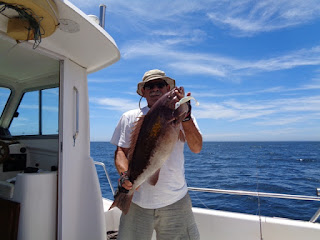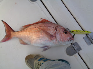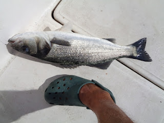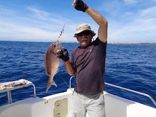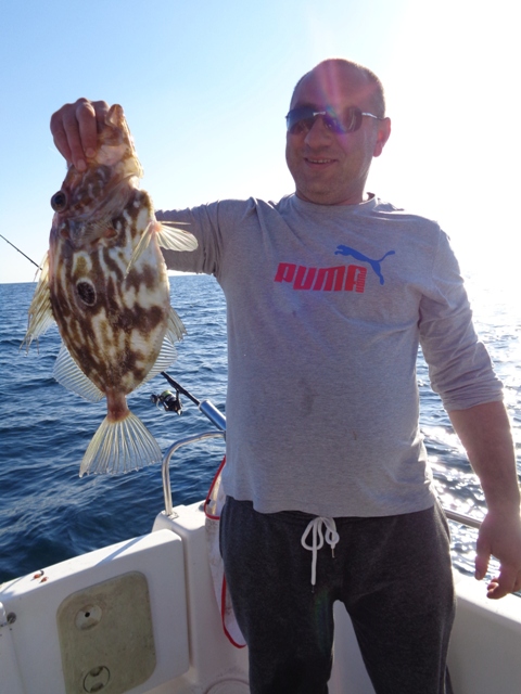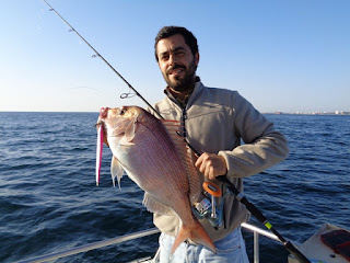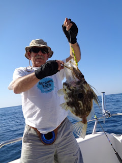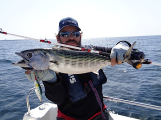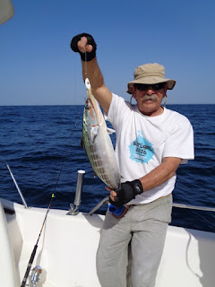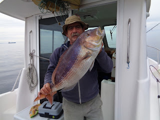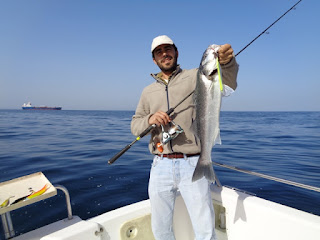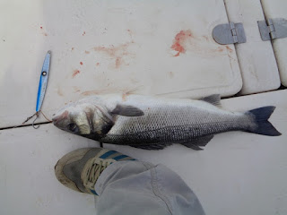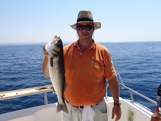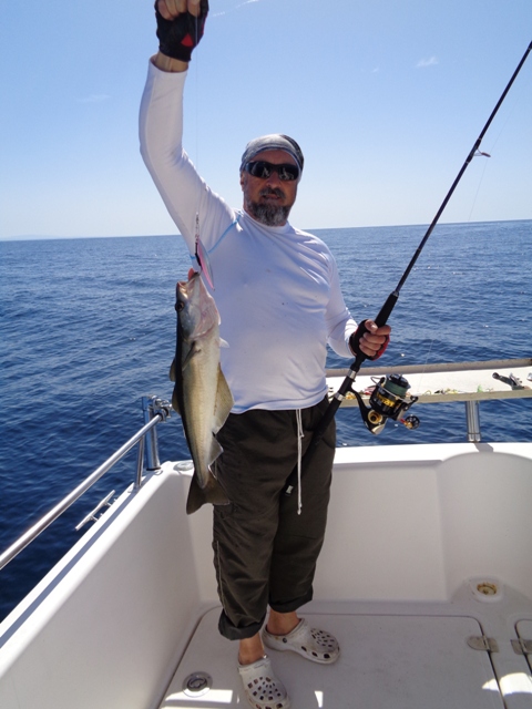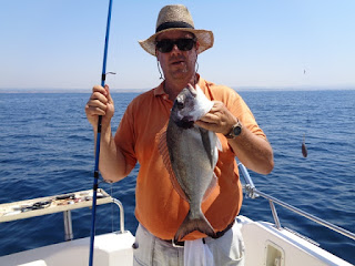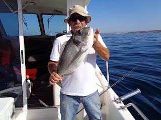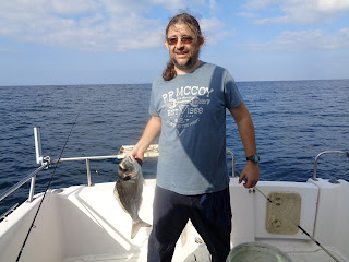 Duas semanas depois, foi a vez de ir com o meu amigo Fernando, num dia de mar chão, em que muito se andou, muito se trabalhou, mas capturas, para além de umas quantas Cavalas e Carapaus, só o Badejo que ele abaixo apresenta.
