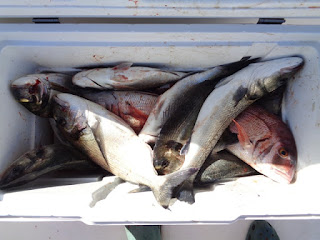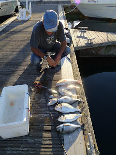 Pesqueiros baixos, alguns sargos legítimos, duas douradas, um sargo veado, com destaque para o maior exemplar que saiu ao meu amigo Gama, também com cavala fresca, "au filet".