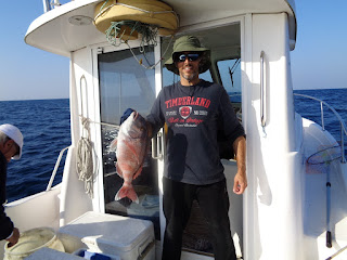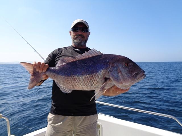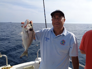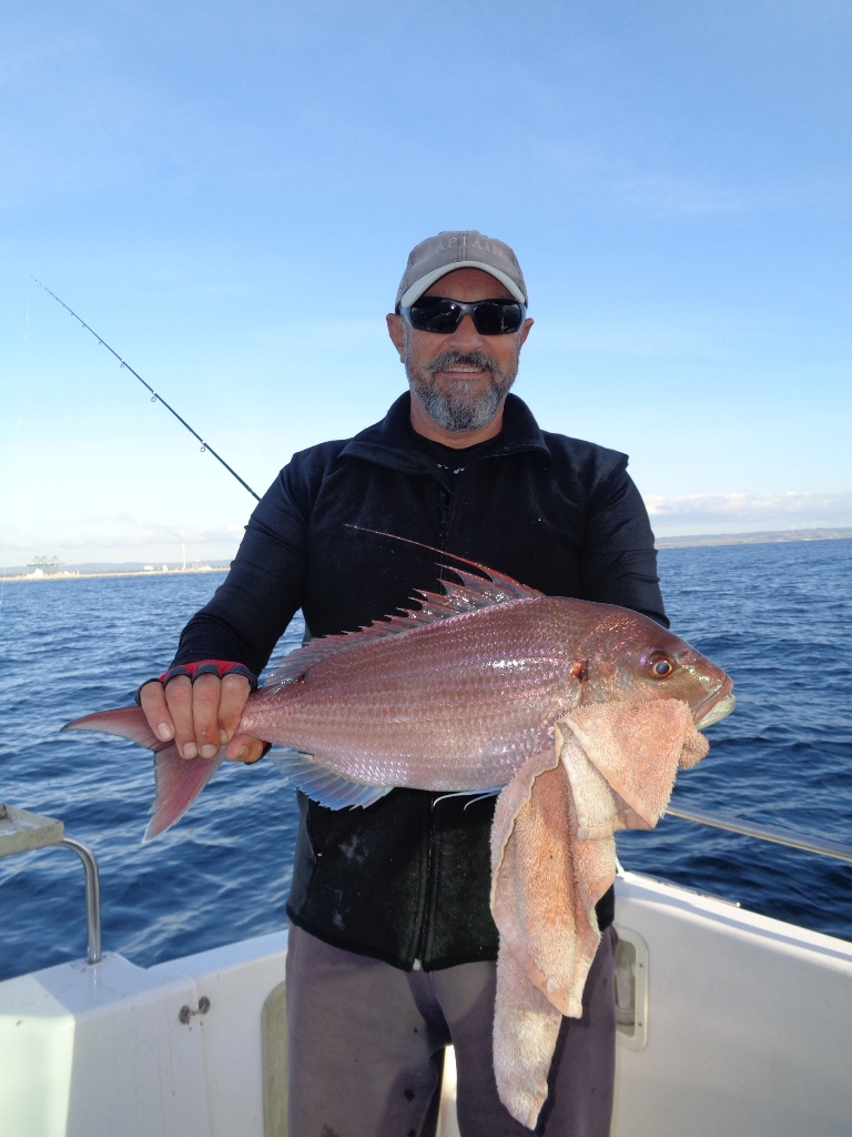 Mas uma coisa é certa, em todas as posições por onde o barco passou, ou parou por momentos, sempre se foi capturando um exemplar ou outro, culminando com 6 Pargos, à volta do quilo e meio, um Sargo legítimo perto de quilo, uma Dourada do tamanho dos Pargos, algumas Sarguetas, e, já no fim, como cereja no topo do bolo, saíram-me 6,300kg deste "marmanjo":