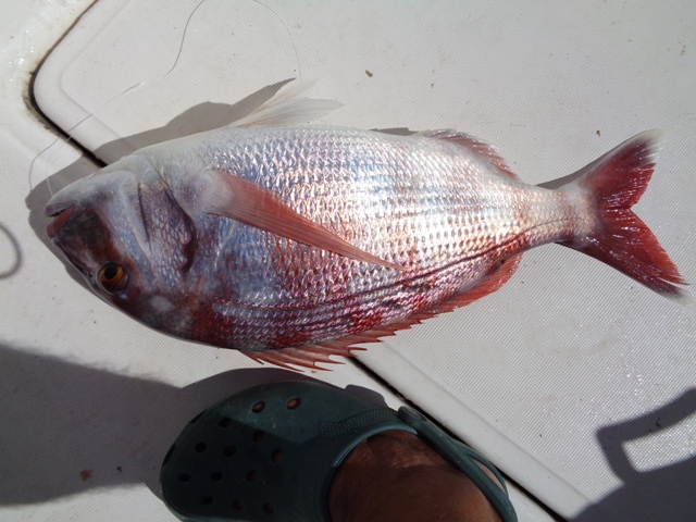 Não muito longe do fundo, a linha começou a sair com rapidez muito superior à da descida, deixei levar mais um pouco e travei-a, primeiro com a mão. A cana dobrou, baixei a asa de cesto e deixei cantar o carreto. Recuperei. Cantou mais duas ou três vezes e fui recuperando nos intervalos, até que cá acima chegasse o Pargo Dourado não muito grande que abaixo se vê.